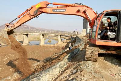 图一: 2018年1月14日,施工人员正在房县化龙堰镇郭家河桃园段捆扎格宾网,修复乡村河堤。