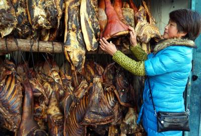 2018年1日16日,十堰市郧阳区白桑关镇白桑关村5组村民陶红正在将自家加工制作的柏树松枝熏黑猪腿、排骨挂在街边出售,入冬以来她家己加工制作的柏树枝熏黑猪腿200个,己出售70多个,仅此就创产值2万多元。春节将近,为销售针对城里人胃口的看家菜陶红一家收购本地土猪腿,加工制作的松香薰猪肉出售,受到过往车辆城里人的喜爱。 视界网周家山 摄