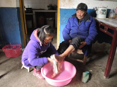 孝敬老人 1月17日,云梦县胡金店镇万民村聂大进家,在镇中心小学读书的孙女放学回家后,给劳累的爷爷洗脚。胡金店中心小学常年开展感恩教育,让学生感受长辈老人亲情,学会感恩,以充满爱心的心态对待社会。 通讯员 黄永强 潘小四 摄 通联 云梦县胡金店镇政府 黄永强 电话 15971282503