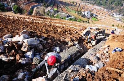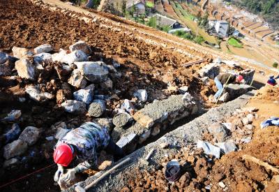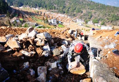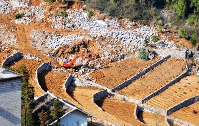 17日,机械和工人在赵家湾村石漠化土地改良现场作业,良田美景初显。