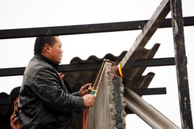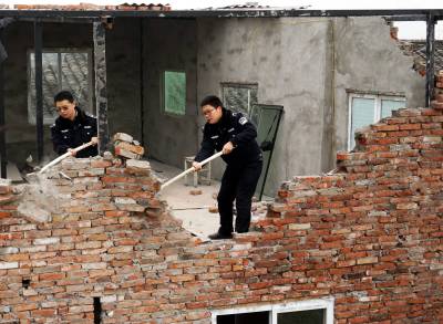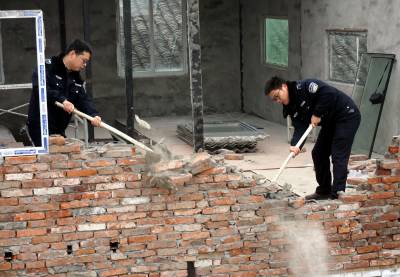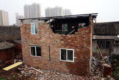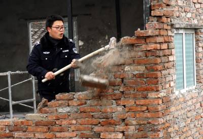 2018年1日18日,十堰市郧阳区安检和综合执法局组织60余人,对牛头岭富楼巷一处二次建房索要补偿的李某某所建100多平方米的二层楼依法强拆。在棚户区改造过程中李某某一家根据国家相关政策己领取了棚户区改造拆迁补偿,但李某某为获取第二次补偿又在原址上加盖扩建成二层楼,在多次劝说无果的情况下18日进行强行拆除,用铁锤强力砸碎李某某向政府索要第二次补偿的黄梁美梦。 视界网周家山 摄