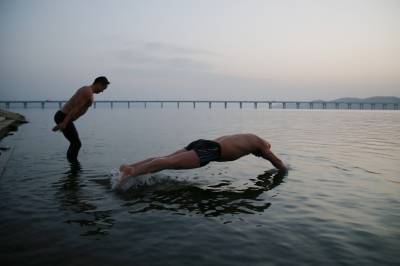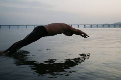 1月20日清晨,冬泳爱好者在十堰市汉江郧阳区段游泳。当日为大寒节气,十堰市郧阳区的冬泳爱好者来到汉江游泳锻炼,强健体魄。(视界网 曹忠宏 摄)