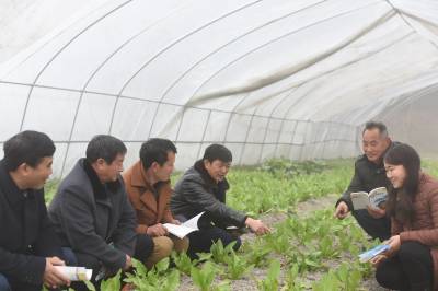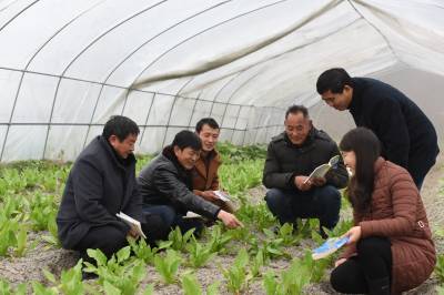 2018年1月20日,大寒日,在湖北省通城县马港镇高峰村大棚蔬菜里,村干部(左四)在向村民会传授种菜技术。