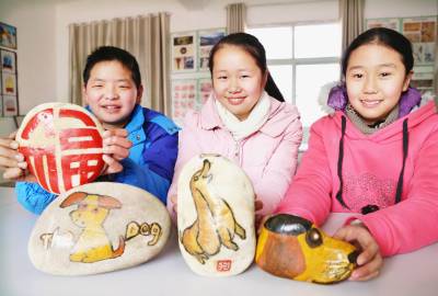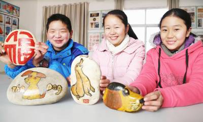 “狗娃”画狗迎新年 1月22日,十堰市郧阳区青曲镇初级中学的属狗学生展示自己描绘的“狗”、“福”等造型石头画作品。狗年即将来临,该校学生在美术教师指导下创作“狗”石头画作品,喜迎新年。 (视界网 张传郧 湖北省十堰市郧阳区青曲镇初级中学 13635714262 442531)