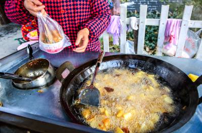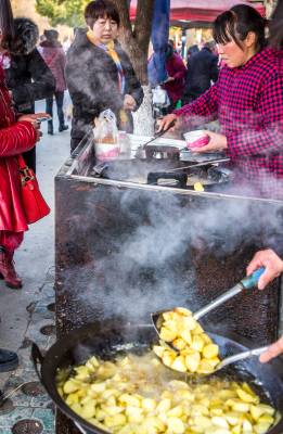 竹溪县人民广场公园周围美食便餐加工业为市民和游客搭起品尝百味生活平台。而最受欢迎、销量最好还数土豆美食加工,每天早晨8点到晚上9点品尝土豆美食消费者络绎不绝。将去皮土豆切成核桃大放进油锅炸熟,用熟芝麻等调料调拌出来5元钱一碗,一碗一式斤毛土豆,平均每天可加工100公斤毛土豆,除成本每天可获纯利润750元,3个人人均一天200多元劳务费,土豆变身“金豆”,既增收又方便大众,是一举两得的劳动收获(视界网周明鑫、温大树摄)。