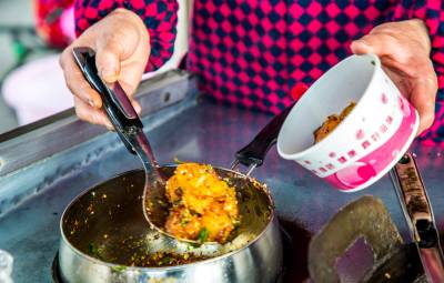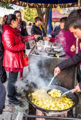 2018年1月17日,土豆美食加工者正在竹溪县人民广场公园傍为顾客加工和调拌炸熟的土豆美食。
