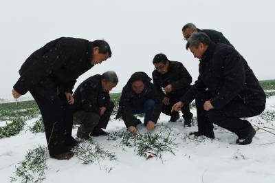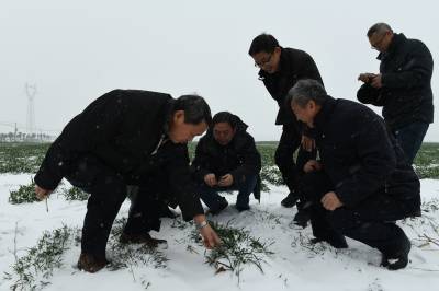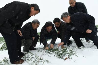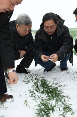 1月24日,西北农林科技大学康振生院士(中)、(中国工程院院士)、中国小麦产业技术体系首席专家肖世和研究员在襄阳市樊城区牛首镇黄丰村麦田里调查小麦条锈病发生现状。当日,襄阳降下年后第二场雪,由农业部组织全国顶级植保专家组成的成员,来到全国十大夏粮主产区的湖北省襄阳市,开展2018年小麦锈病、白粉病、蚜虫等病害越冬基数调查测报,了解2018年春季小麦病害发生流行的影响,以便于全国病虫害准确测报和及时防治。这次专家组调查点为湖北、陕西、四川3省。
