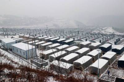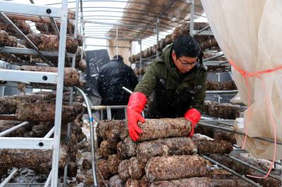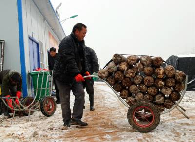 1月24日,受冷空气南下影响,湖北省十堰市迎来大范围降雪天气。郧阳区香菇小镇产业扶贫示范园里,贫困户将第二茬香菇菌棒装车上架。