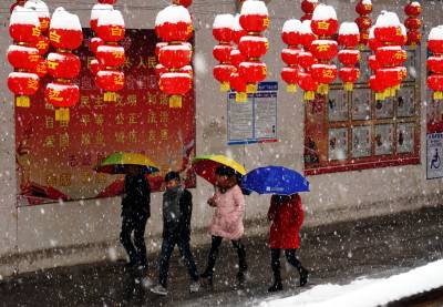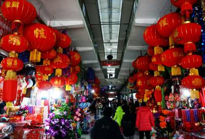 2018年1月25日,临近春节越来越近,在大雪纷飞的天气里十堰市郧阳区的许多市民还是来到通达市场选购喜庆的中国红传统装饰品,大红灯笼、福字、中国结等,使年味也越来越浓。 视界网周家山 摄