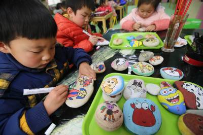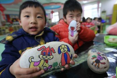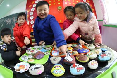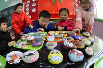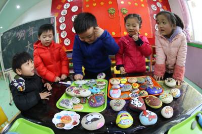1月24日,幼儿园的小朋友在汉江石上绘生肖狗。