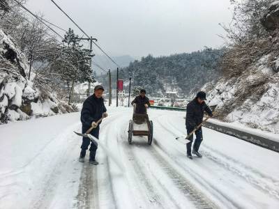2018年第二场雪莅临十堰,交通受阻。茅箭区茅塔乡康家村村委会上路撒盐化雪。