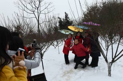 1月26日,在雪后的湖北省襄阳市万山梅花园,市民踏雪游园欣赏绽放枝头的腊梅花。