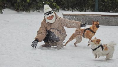 > 武汉瑞雪连续三天纷飞 美女乐爱犬跳喜迎新春狗年到