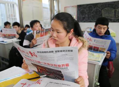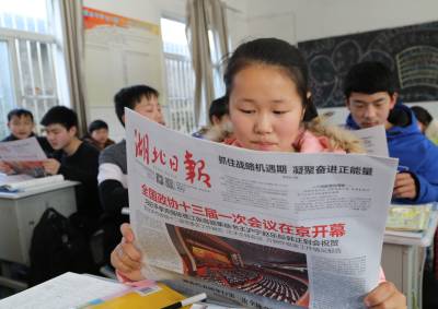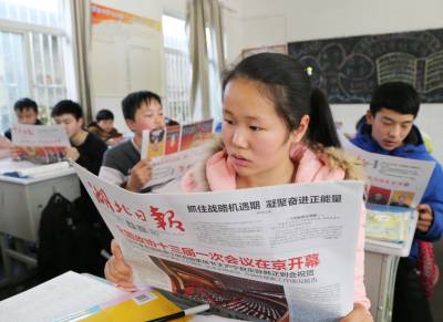 山里娃关注“两会” 3月13日,十堰市郧阳区青曲镇初级中学的学生在认真阅读《湖北日报》发表的“两会”新闻报道。全国“两会”在北京召开期间,十堰市郧阳区青曲镇初级中学积极开展“中国梦、我的梦——关注2018年‘两会’”主题教育活动,旨在让学生们了解全国“两会”的相关知识和精神,引导他们关心国家大事,增强他们为国立功的责任感和爱国热情。 (视界网 张传郧 湖北省十堰市郧阳区青曲镇初级中学 13635714262 442531)
