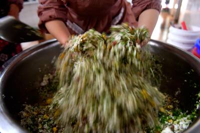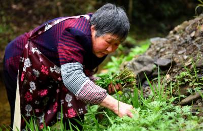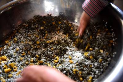 3月14日,恩施州宣恩县高罗镇火烧营村范先凤老人正在用土家手艺制作社饭。