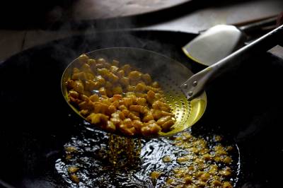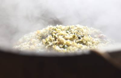 社饭的主要配料是香蒿,土家儿女在过社前将田园、溪边、山坡上的鲜嫩香蒿采撷回家,将其洗净、剁碎,然后在清水中反复搓、洗,挤出苦汁,并将拧尽积水的香蒿在锅中用文火焙干,再把上好的腊肉、腊肠、豆腐干洗净煮熟切成小指尖大小的丁,配上切细的野葱在油锅中加盐爆炒,再用木甄蒸熟即可。