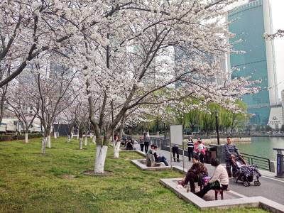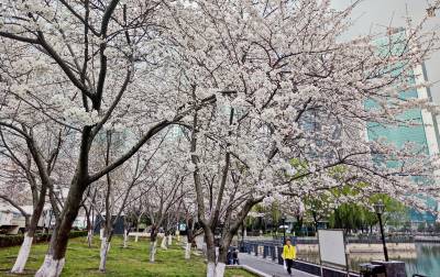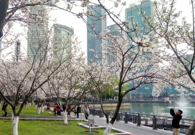 连曰来的武汉市,春暖气温髙。让寸土如金的江汉区汉口西北湖绿化广场西湖畔的早期樱花盛开,美不胜收。