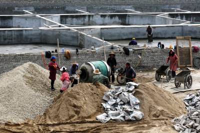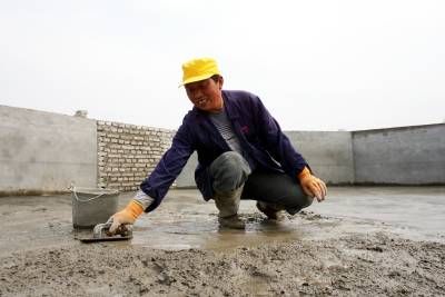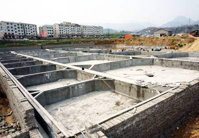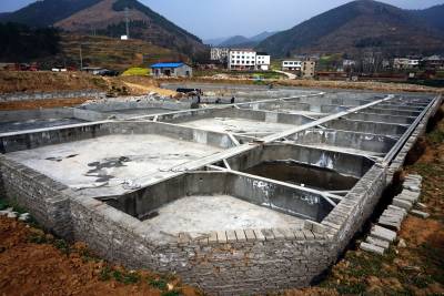 2018年3月14日下午,十堰市郧阳区南化塘镇滔河西岸,施工人员正在砌筑养鱼池,这是南化塘村村民陈泽胜投资100多万元建设的占地6亩的流动式水泥养鱼池,今年将投入15万尾鱼苗在新池里养殖,年创产值可达500万元。虹鳟鱼和鲟鱼已在南化引进养殖7年,村民们己有养殖经验,鲜鱼上岸供引应求。 视界网周家山 摄