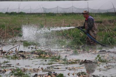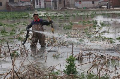 2018年3月17日,云梦县下辛店镇丰乐村村民陈武桥在水中使用高压水枪忙着挖藕。水中挖藕是一项力气活,也是一个技术活。陈武桥有一手水中挖藕的好手艺,有人雇请,就去挖藕,成为当地有名的职业挖藕人。在摄影师拍摄他在淤泥中挖藕的镜头时,陈师傅问拍摄的图片哪里可以看到,北京可以看到吗?摄影师说,如果报刊、网络等新媒体采用,全国可以看到的。摄影师问,为什么要北京能够看到。陈武桥师傅说,他的儿子在北京当兵服役。摄影师说,啊,原来是这样!但愿你儿子能够看到爸爸在家乡挖藕劳动的生活,激励自己在部队好好服役,当一名优秀的军人,用行动回报父母!