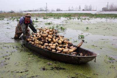 每到挖藕时节,陈武桥便穿上一身笨重的皮衣皮裤去劳动。即使是天寒地冻,也是双腿浸在荷塘里,一步步踩着淤泥,一手拿着高压喷水枪,一手探索着在淤泥中掏出藕来。每天一早就开始挖藕,有时顾不得吃饭,午餐几乎挤到晚餐一起完成。每天花出数小时劳动,中途几乎不休息。如果是比较好挖的地方、一天可以挖五六百斤的藕。陈武桥介绍,他们这里每挖一斤藕的报酬是4角钱,但每百斤要除掉15斤再计价,实际每百斤就只算做是85斤,再乘以每斤4角,就是实际收入。这样辛苦一天,日收入大约就在200元左右。