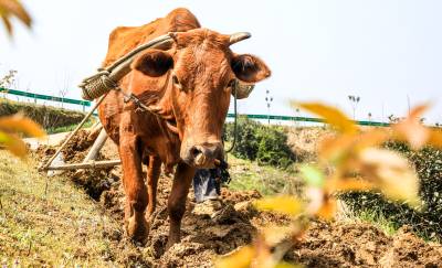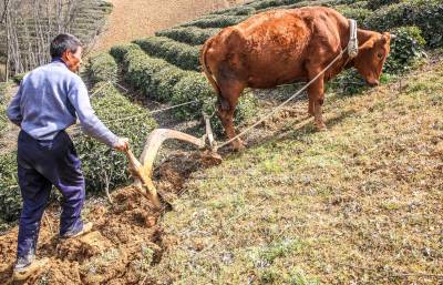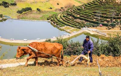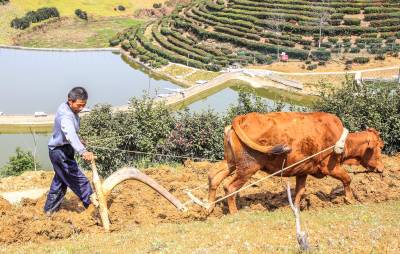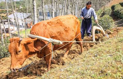 2018年3月21日,竹溪县水坪镇纪架山村民陈昌志正在使牛翻耕春播生产自留地。 当日是农历二十四节气“春分”过了春分节,秃枝吐翠复青,种子入地生根的春耕春播重要时节。竹溪县各地家民抢抓生产黄金时令忙耕备种(视界网温大树摄)。