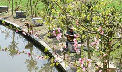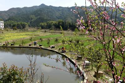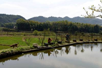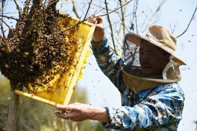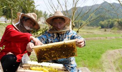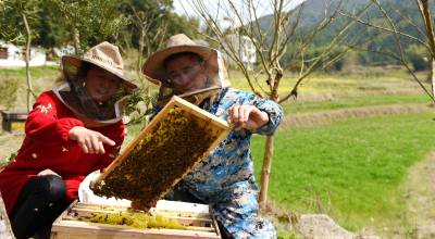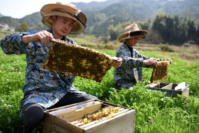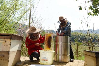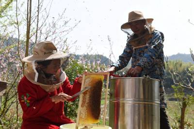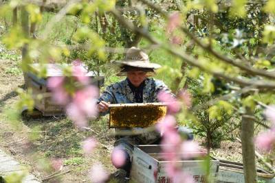 3月22日,在湖北省通城县沙堆镇罗塘村中蜂专业合作社社员在养蜂。 通城县山地资源丰富,蜜源植物较多。春天油菜花、樱花竟相开放,山花灿烂。当地利用这些优势,出台扶持政策,支持农户发展养蜂,已有千余户农民从事甜蜜事业,尝到了甜头。