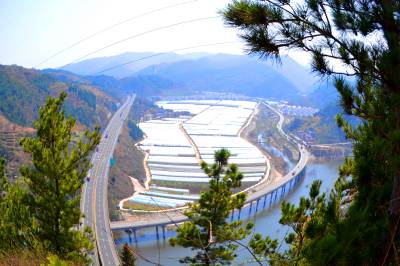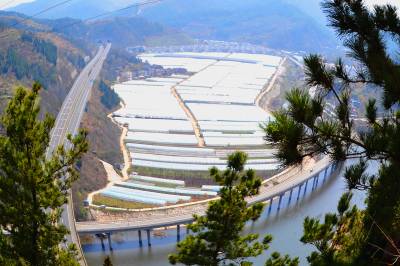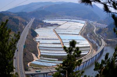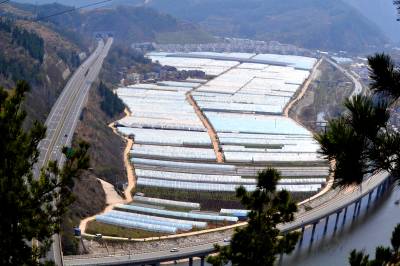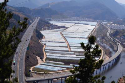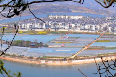 2018年3月23日,湖北省十堰市郧阳区挖断岗村千个脱贫果蔬“万元棚”,与环绕的高速路、国道和别墅新村构成一幅美丽的图画。
