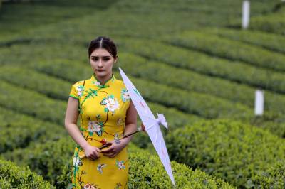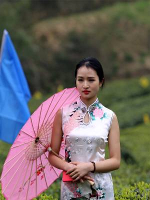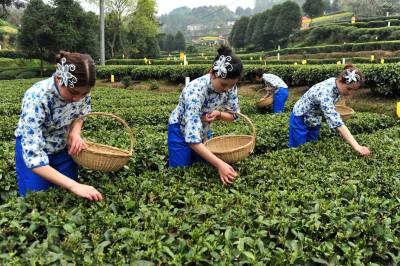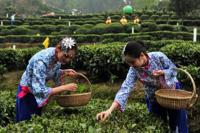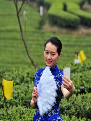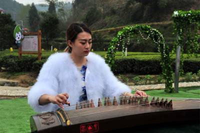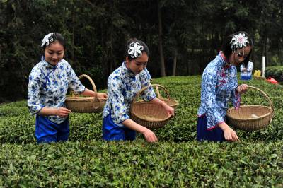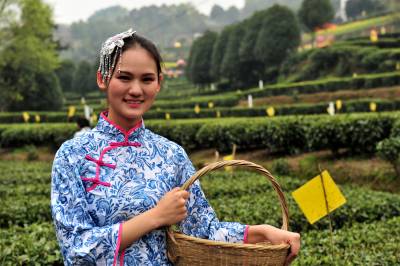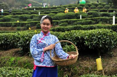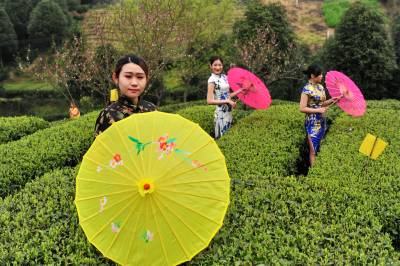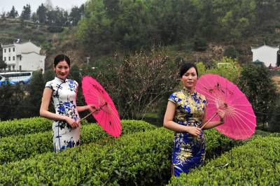 2018年3月24日,湖北省2018年茶文化游宜昌分会场暨宜昌市“缤纷四季-乡约夷陵”乡村游活动在三峡坝区库首第一镇太平溪镇精彩启幕,当地三峡仙姑身着青花瓷、旗袍等盛装,走进秀美的生态茶园喜迎八方宾客,让游客们徜徉在山环水绕的生态净土,闻清新茗香,品风土人情,赏乡村雅趣,听耕耘小调,“醉”美的山水田园风景尽展了峡江魅力。视界网 张国荣 摄
