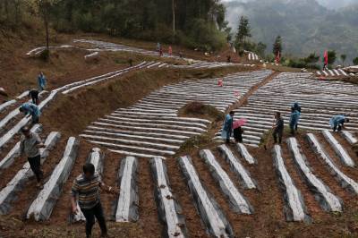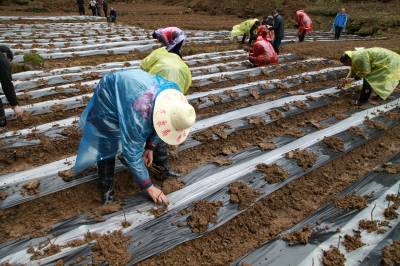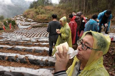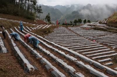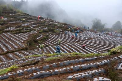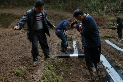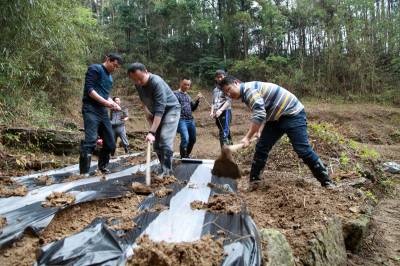 拉开为期两天的抢栽藤茶劳动场面。据悉,小河村将发展300亩藤茶,目前正值栽种最佳时机,由于村里年轻人均外
