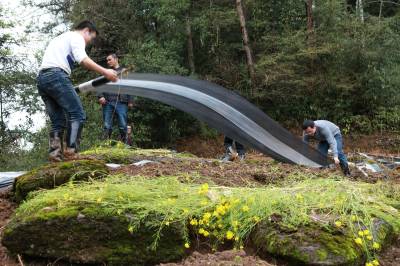 动场面在烟云升腾、细雨霏霏的水墨画中拉开序幕,大家用汗水、雨水陇起的白色藤茶成路成行,宛若一条条哈达,