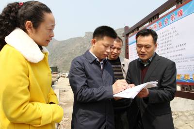 图二:湖北十堰市房县县委副书记、县长纪道清(右二)在研究堵河房县段河长公示工作。