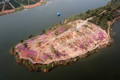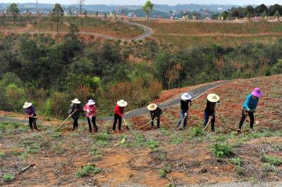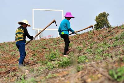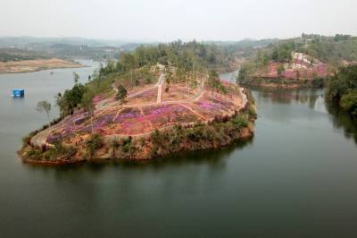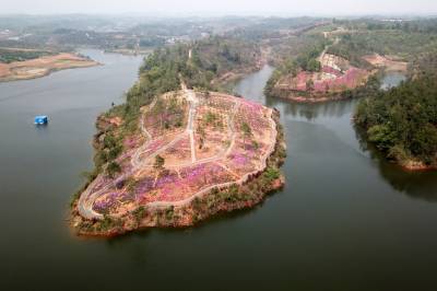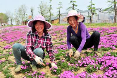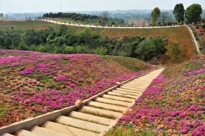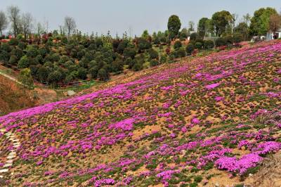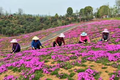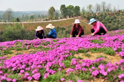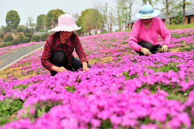 2018年3月28日,阳春三月,宜昌市夷陵区鸦鹊岭镇芝樱农庄花卉基地里的芝樱红花竞相绽放,一些村民在家门口的“花海”中除草劳作,红艳的花儿映红了张张的笑脸,农庄里处处呈现多彩绚丽的大美乡村风景。