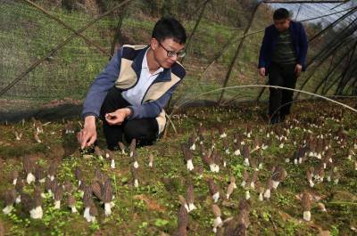 3月28日,在襄阳市谷城县南河镇岛岩村羊肚菌基地,工作人员正在观察羊肚菌的长势。据了解,基地负责人陈进林是一位90后创业者,2017年在湖北随州、襄阳地区投入30亩地用于种植羊肚菌。近日,在襄阳市谷城县南河镇岛岩村所种的羊肚菌长势喜人,准备丰收。预计亩产量200-300斤,按市场测算2万元。陈进林介绍,下半年准备投入100亩地种植羊肚菌,带动周边的村民一起,将有效促进农民增收致富。据悉,羊肚菌是一种珍稀的野生菌种,因其菌盖表面凹凸不平,状如羊肚而得名,随着栽培技术的不断成熟,目前已可人工种植。(视界网 李旭晖 摄)