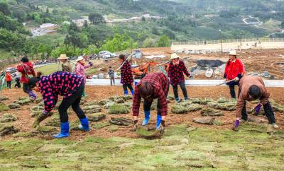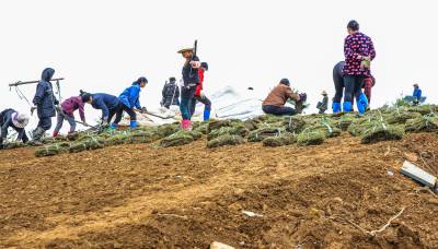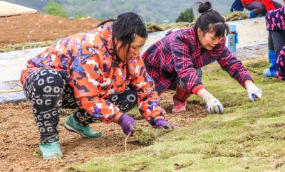 2018年4月14日,十堰市竹溪县就地务工增收村民正在该县龙王垭茶场辖区整理荒山裸土覆盖草莲、披绿生态文化旅游茶道。