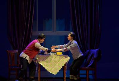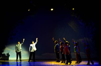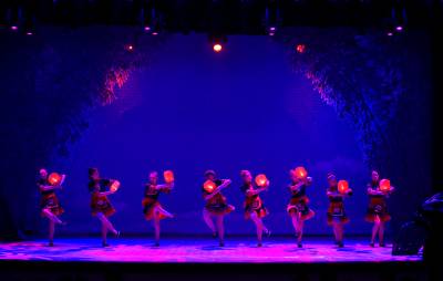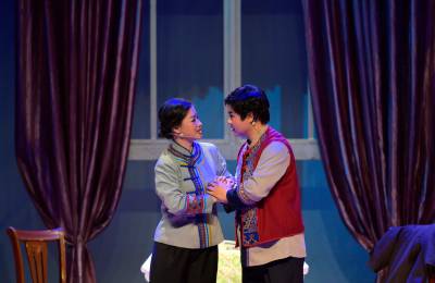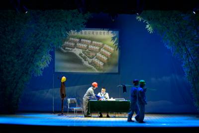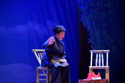 7月8日晚,演员们在宣恩县礼堂演出大型现代土家南剧《初心》。