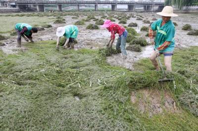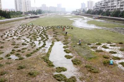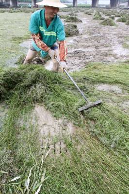 2018年7月9日,民间河流保洁人员在房县城区西河清除枯萎的水生植物。房县河流卫士来自民间群众,主动参与打捞河流水面垃圾、清除河道内枯萎的水生植物,保洁沿河两岸的卫生,是“护理”清水河的主力军。目前,当地民间河流卫士保洁全县314条河流水生态环境形成常态化,水清、河畅、景美成为鄂西北地区生态河流的一张名片。
