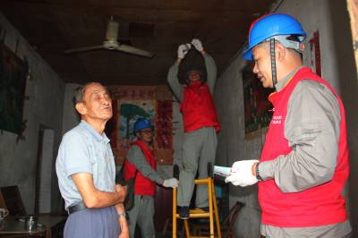点滴关爱保安全 真情温暖老人心 7月10日,国网谷城县供电公司共产党员服务队队员在石花镇苍峪村帮助留守老人方明益检查用电线路后更换灯泡。该公司党员服务队情系空巢、留守老人,抢在夏季用电高峰前,已为2637户老人检查线路、开关、更换刀闸、漏电保护器等。(视界网马明刚摄)