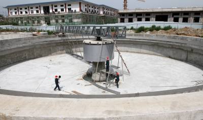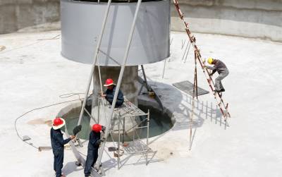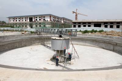2018年7月11日,施工人员在焊接房县城区生活污水处理厂辐流沉淀池刮泥设施。该项目是鄂西北地区生活污水处理厂提标升级改造重点工程项目之一,投资3600万元,将2座生化沉淀池(18.0m×16.0m×5.5m)改造为好氧曝气池,新增2座二沉池、2座滤布滤池和管网设备,设计规模30000吨/日,处理后的出水水质由原来B级达到一级A标准。通过生活污水处理厂提标升级改造,大大改善居民生活环境质量,净化河流水质。
