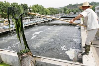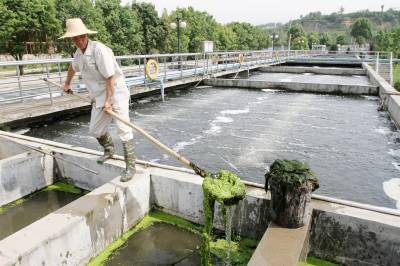 2018年7月11日,施管理人员在房县城区污水处理厂打捞沉淀池青苔。鄂西北房县地处国家南水北调丹江口库区水源区上游。该县加快建设城乡生活污水处理工程,实施源头治污,预防河流水污染。目前,完成建设城乡重点污水处理厂7座,村级生活污水收集处理工程129个,累计处理城市生活污水520万吨,乡村污水处理率达到88%。目前,该县治理后的生活污水达到国家一级B类以上排放标准,饮用水源地水质达标率跨入全省前列,河流水质提级达标。