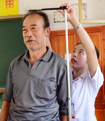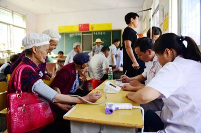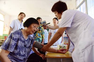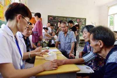7月12日,在恩施市白杨坪镇朝阳坡村小学,专家正为前来看病的村民检查、问诊。