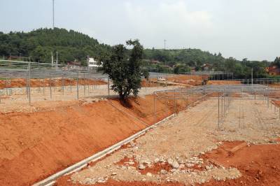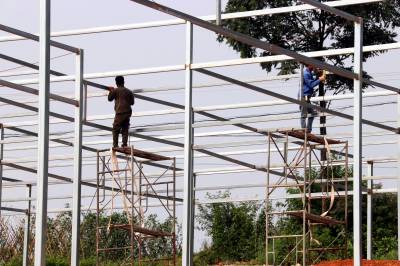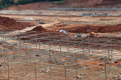 7月12日,工人在十堰市郧阳区香菇小镇产业基地二期工地建设现场施工。