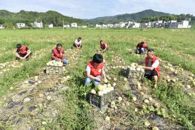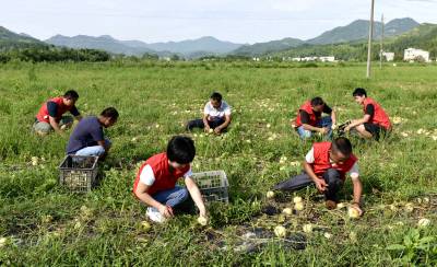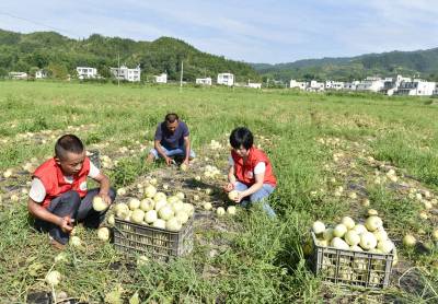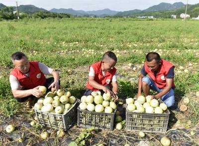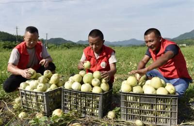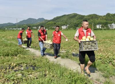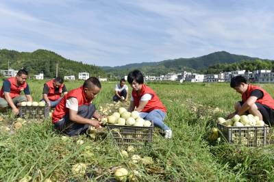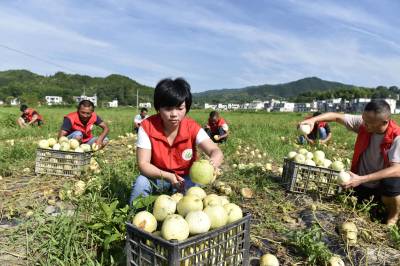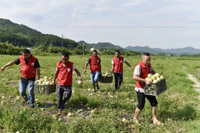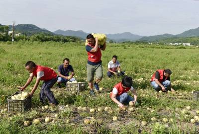 2018年7月14日,在湖北省通城县马港镇白竹村甜瓜基地,党员志愿者帮助瓜农采摘甜瓜,准备运往县城市场销售。 通城县白竹村4名创业青年成立七彩农村合作社,流转200多亩土地,种植甜瓜,吸纳带动周边58户贫困户就业。今年首种甜瓜丰收,总产量10万斤。甜瓜采用有机种植,脆甜、肉厚、水分足。