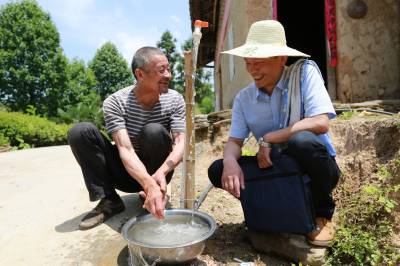 “我们人老几代都是到河沟小水井挑水吃,真没想到这辈子还能吃上自来水。” 7月16日,竹山县宝丰镇曹家沟村二组村民汪吉福(左)看着哗啦啦的自来水满脸感动。解决村民吃水问题是第一件大事,在竹山县教育局驻村扶贫工作队和县水务局的帮扶下,四处找水源,实地勘测设计,经过数月奋战,建成饮水管道14公里,让曹家沟村200多户近700人吃上了安全洁净的自来水。
