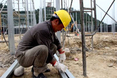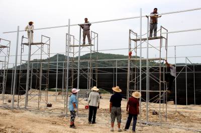 7月16日,在郧阳区柳陂镇沙洲村香菇菌棒厂,工人们冒着高温正在搭建香菇大棚。据悉,该厂区占地面积21.6亩,建筑面积13000多平方米,投资1000多万元,年总生产香菇菌棒200万棒,可带动600多户3000余人发展香菇种植脱贫致富。 孟 江 董发兵