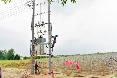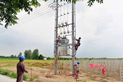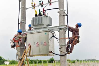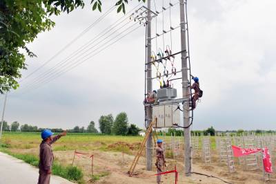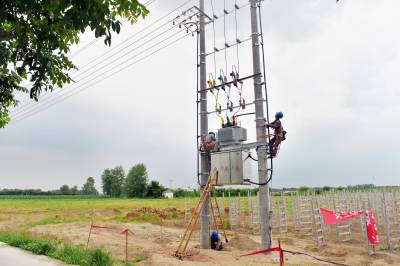 7月17日,在襄阳老河口市仙人渡镇仙鹤社区马岗村,来自国网老河口市供电公司的施工人员正在田间地头新架一台200千伏安的机井灌溉专用变压器,解决村民抽水抗旱用电难题。今年以来,该公司已完成村村通动力电和机井通电131个台区,累计投资3244万元。