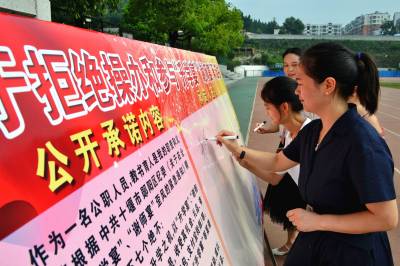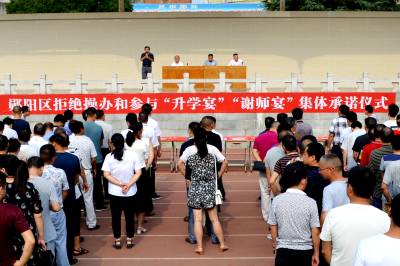当日,湖北省十堰市郧阳区纪检、教育等部门联合举行“郧阳区拒绝操办和参与‘升学宴’‘谢师宴’集体宣誓签字仪式”活动,倡议老师、学生及家长拒绝“谢师宴”,倡导以书信、手机短信、微信等形式的“谢师雁”,用文明、自然、节俭、廉洁的方式表达对老师辛勤培养的感激之情。