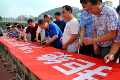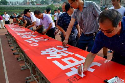 2018年7月18日,郧阳区老师、学生及家长在“拒绝‘谢师宴’‘升学宴’”横幅上签字。