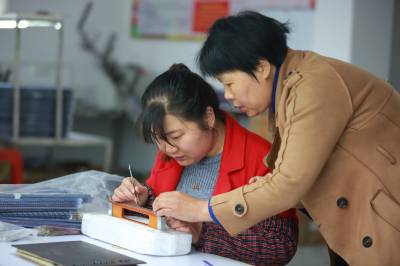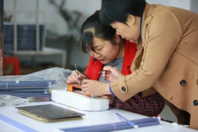 3月23日,在湖北省竹山县麻家渡镇荣华电子扶贫车间,曾荣华(右)正在“手把手”指导员工学习加工网络滤波器技术。