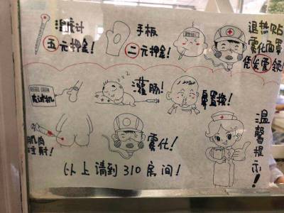 上面用卡通图手绘配以简短的文字说明,介绍了肌肉注射、皮试、灌肠、雾化等流程,以及领取体温计和手板的相关事宜,让人看了,既一目了然又非常可爱。