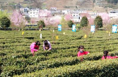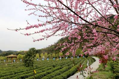 3月31日,竹山县竹坪乡陈家河无性系茶叶基地里,上百名妇女边欣赏着茶园里的桃花、樱花、李花,边采摘茶叶。